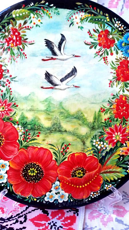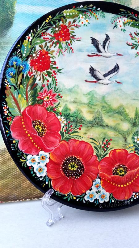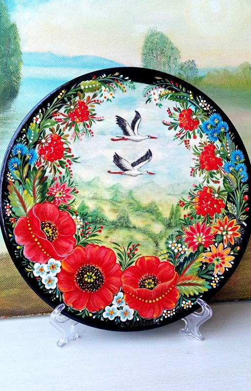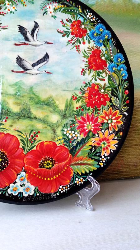 Декоративная деревянная тарелка "Путь в дом", авторская ручная роспись. Петриковская роспись. Дерево бук, краски акрил, гуашь, глянцевый лак. Размер 23,5 см.