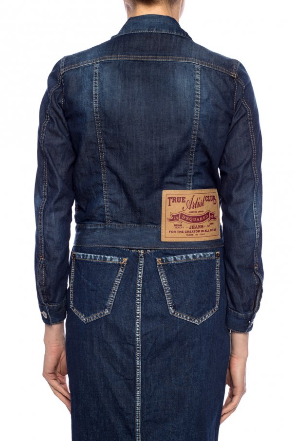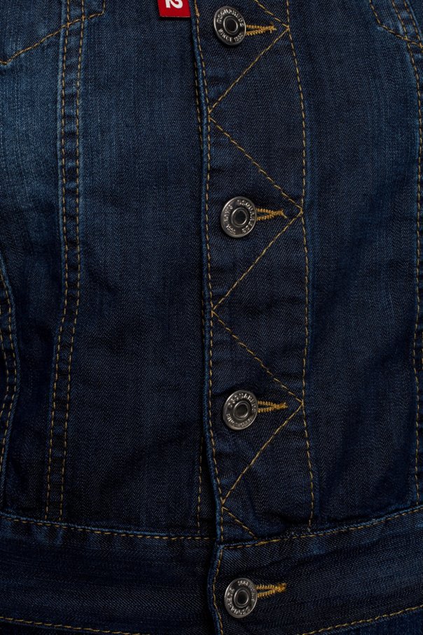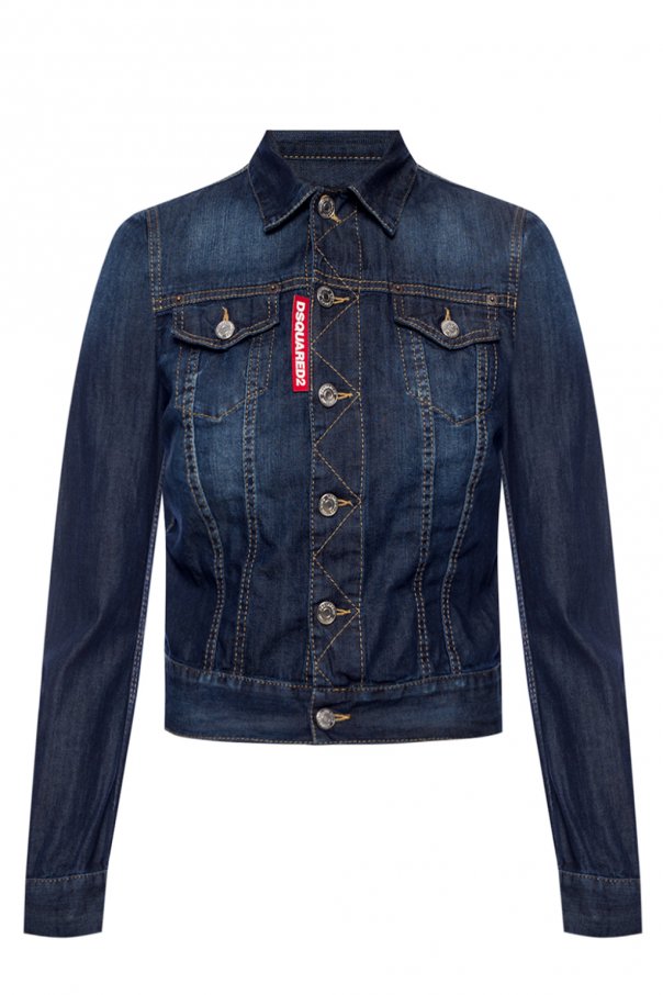 Navy blue stonewashed denim jacket from Dsquared2. Fastened with buttons. Embellished with orange stitching details. It features long sleeves and 2 buttoned flap pockets on the chest.