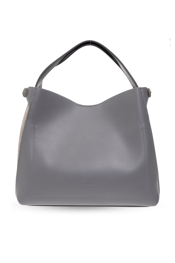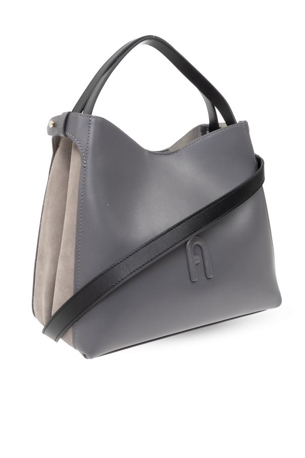 Grey ‘Primula Small’ shoulder bag from Furla. Made from leather and suede, this design secures and adjusts with snaps and showcases an embossed logo on the back and tactile ‘Arch’ detailing on the front. It is complete with a detachable and adjustable shoulder strap, two half-round handles in black, light gold-tone metal hardware and one internal compartment with one slip pocket and one zip pocket.
