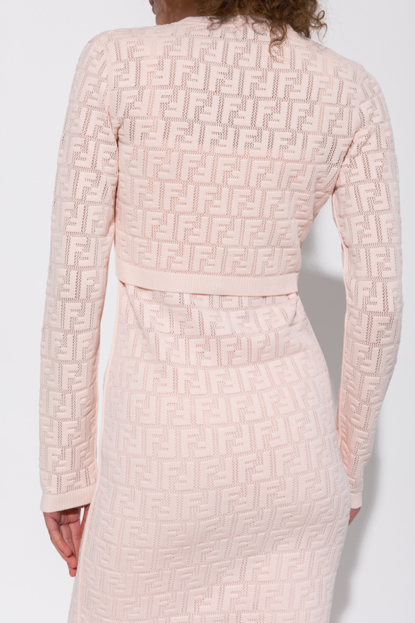Light pink cardigan from Fendi. with a body-fitting, cropped silhouette made in stretchy FF monogram fabric, this style features button fastenings, a V-neckline and elasticized edges.