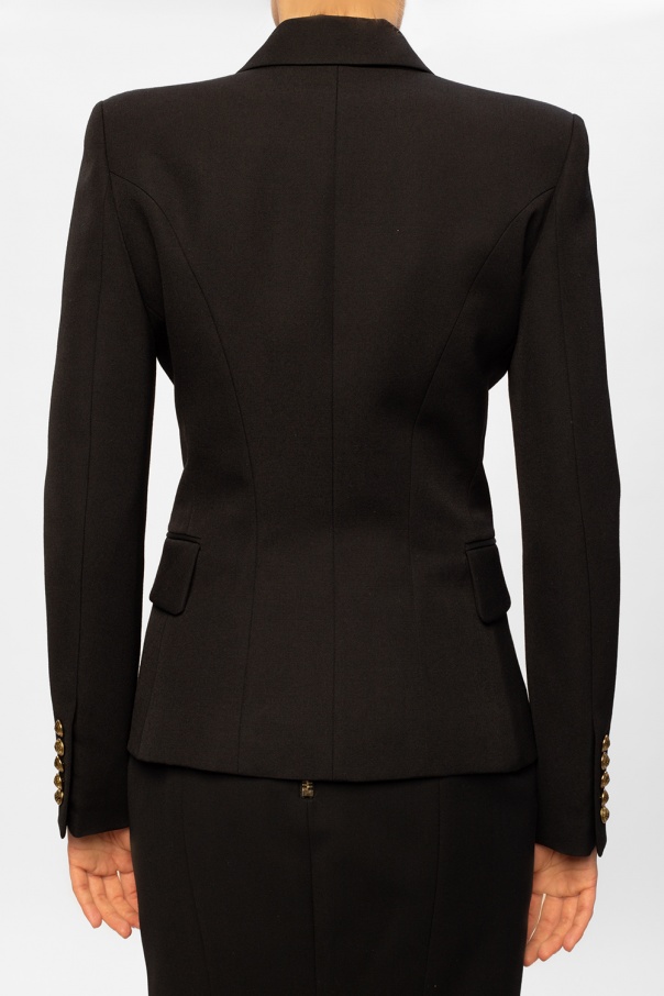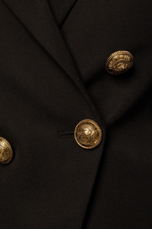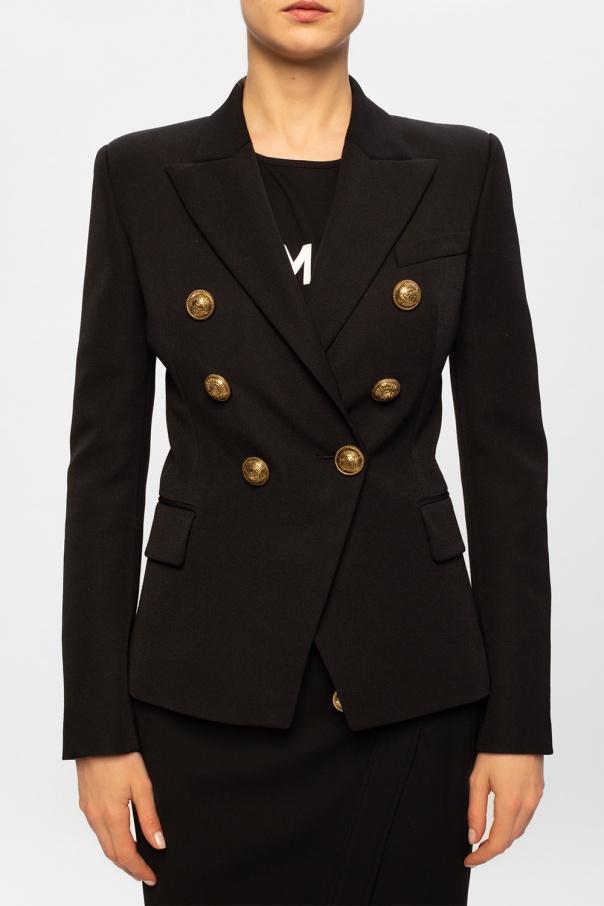 Black double-breasted blazer with peak lapels from Balmain. Made of wool. Fastened with decorative buttons featuring a logo in antique gold-tone. Two flap pockets and a slip pocket.
