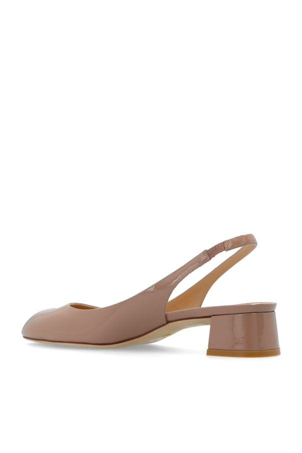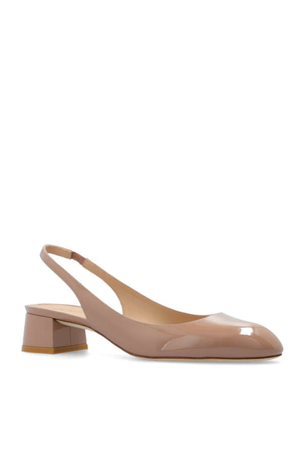 Blush pink ‘Vivienne’ pumps from Stuart Weitzman. Made of coated leather with a glossy finish, this model sits on a light beige leather sole and features an elasticized slingback strap and a round toe.