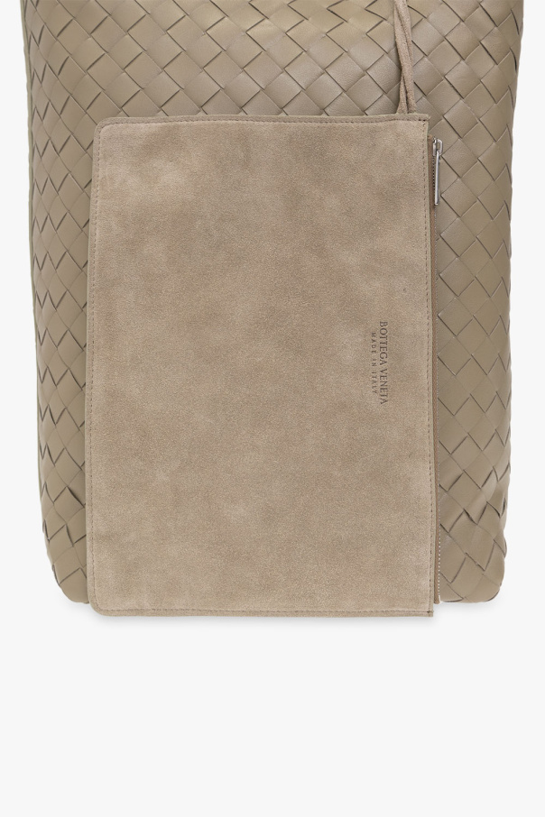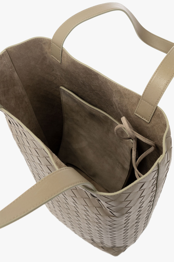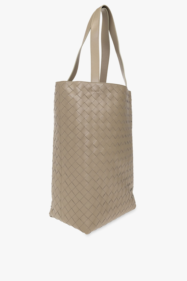 Greyish green shopper bag from Bottega Veneta. Crafted from calf leather with the brand\'s signature ‘Intrecciato’ weave, this design features two handles and one internal compartment with a removable suede zip pocket.