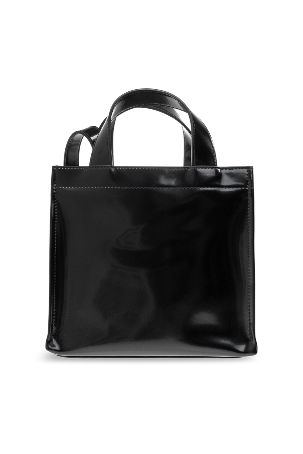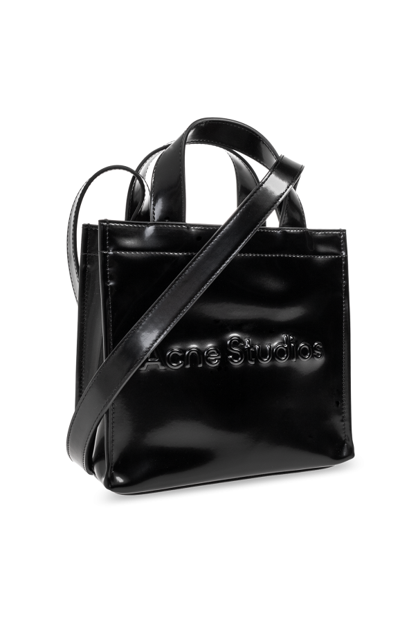 Black shoulder bag from Acne Studios. Crafted with a glossy finish, this design secures with a snap and showcases a tactile logo on the front, two half-round handles, shoulder strap and one internal compartment with one slip pocket and one zip pocket.