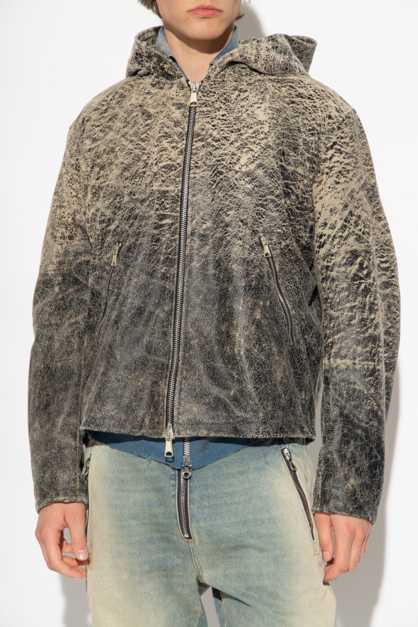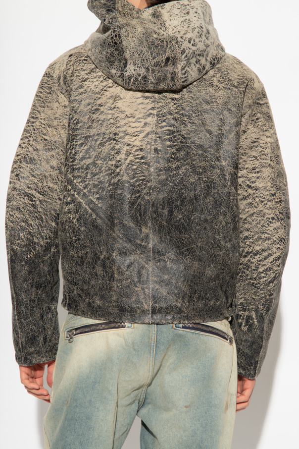 Black and beige ‘L-RAM’ jacket with a hood from Diesel. Crafted from lamb leather with distressed detailing, this style features a two-way zip fastening, two zip pockets and long sleeves with drawstring cuffs.