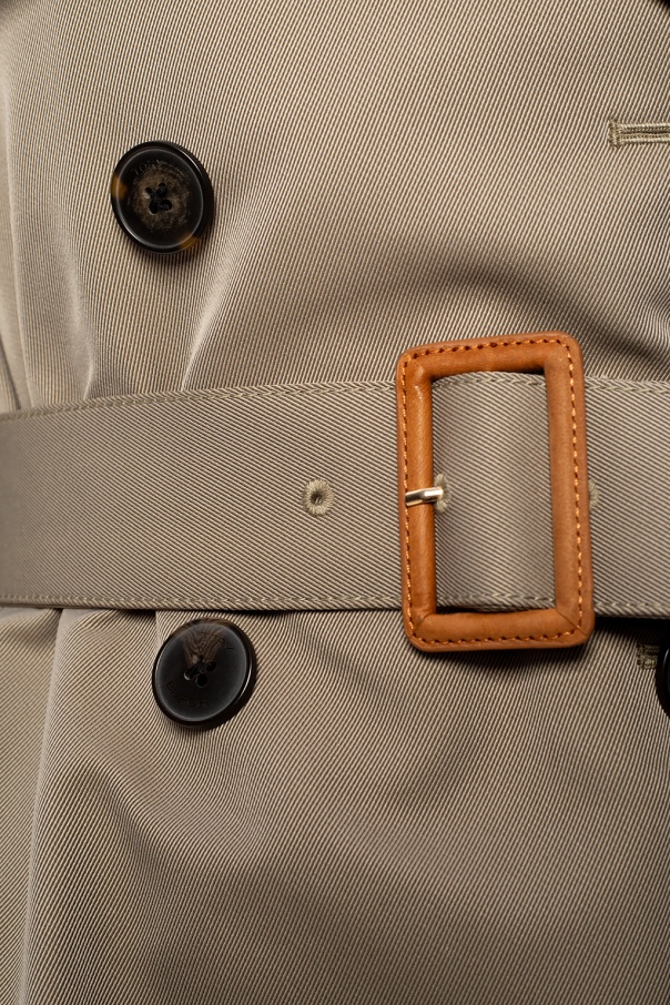Grey trench coat from Tory Burch. Featuring double-breasted design, this piece of outerwear employs button fastening, long sleeves, buckle belt at the waist, epaulettes on the shoulders, two jetted pockets on the front and single vent on the back.