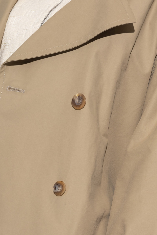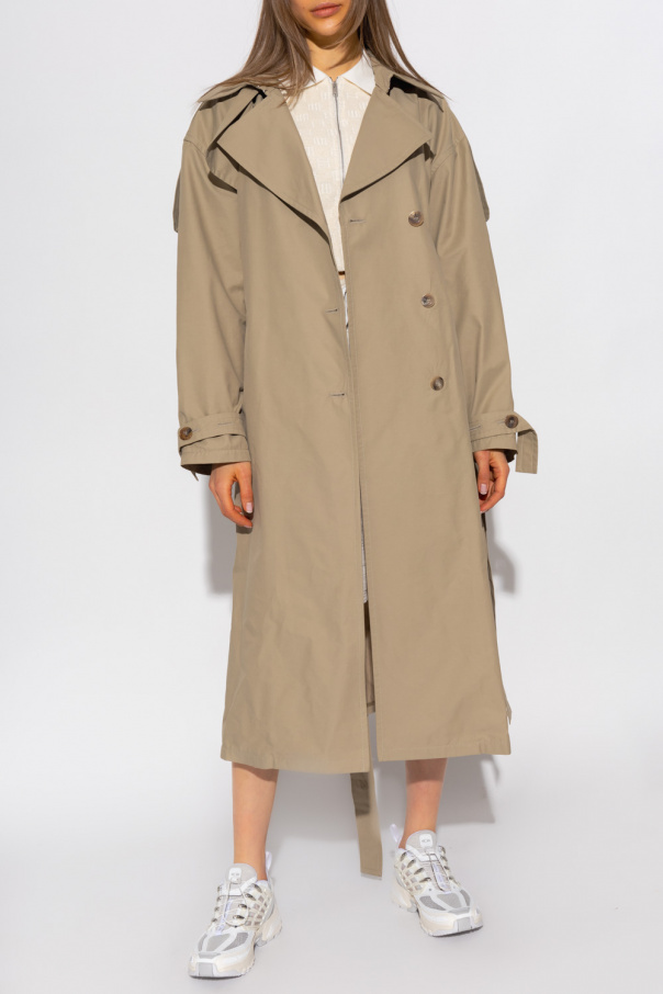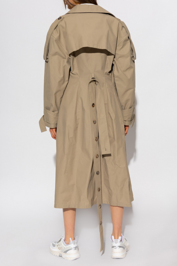 Beige trench coat from Ambush. Fastened with buttons and a waist belt, this garment features hook fastenings, loose-fitting silhouette, epaulettes on the shoulders, notch lapels, two slip pockets, side slits and long sleeves with buttoned tabs at the cuffs.