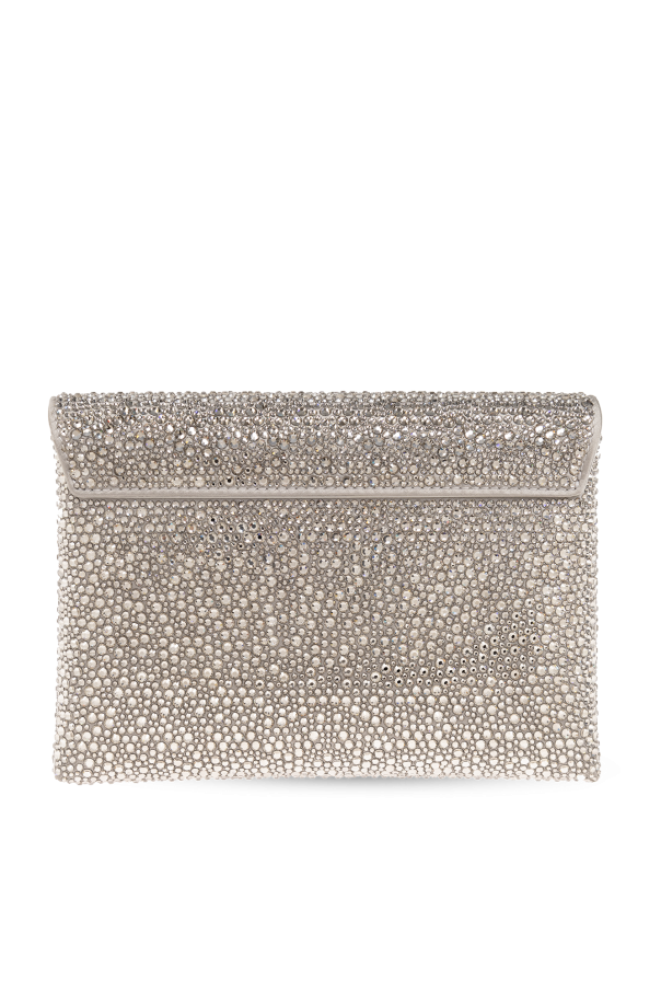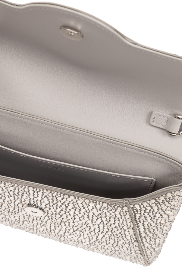 Grey \'La Medusa\' satin clutch from Versace. Spruced up with sparkling crystals, this design fastens via a magnetic snap and showcases the brand\'s signature Medusa head on the front, silver-tone metal hardware as well as a long and detachable chain strap and one internal compartment with a slip pocket.