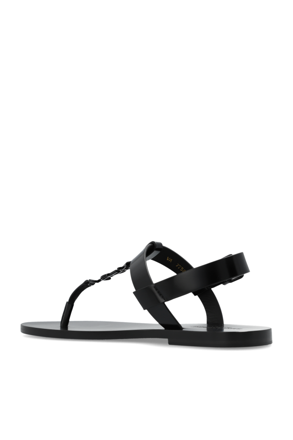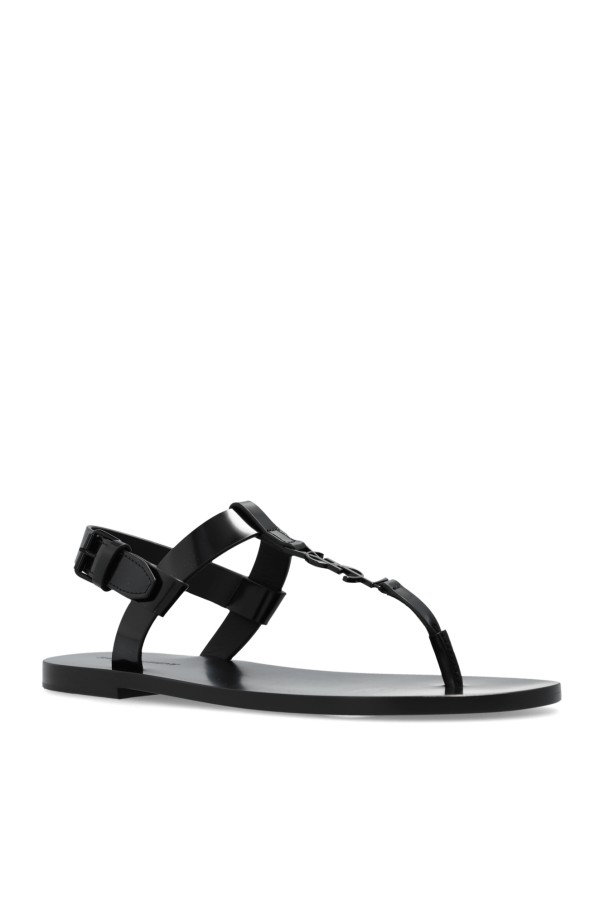 Black ‘Cassandre’ sandals from Saint Laurent. Made from smooth leather, this model sits on a black leather sole and features an adjustable side strap with a buckle and a black logo emblem on the front.