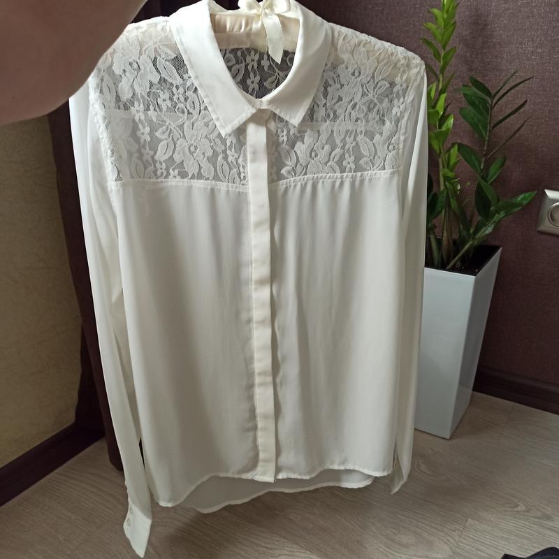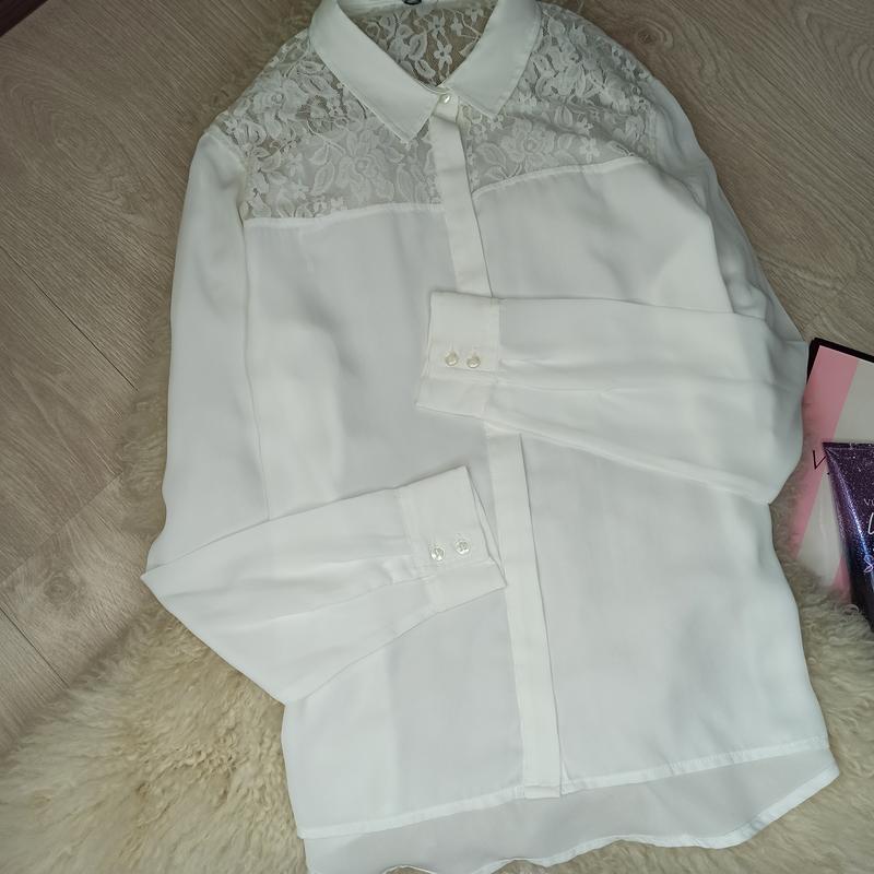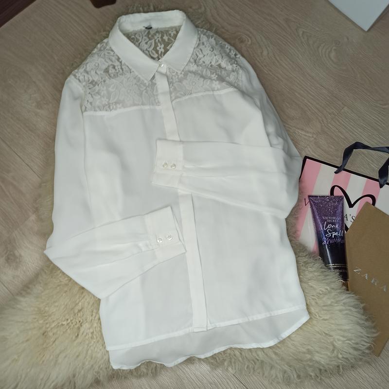 Шифонова блуза з мереживом. Розмір С. Плечі 40 см. ПОГ 50 см. Довжина 59/67 см. Рукав 62 см. Стан ідеальний. Ціна 199 грн.