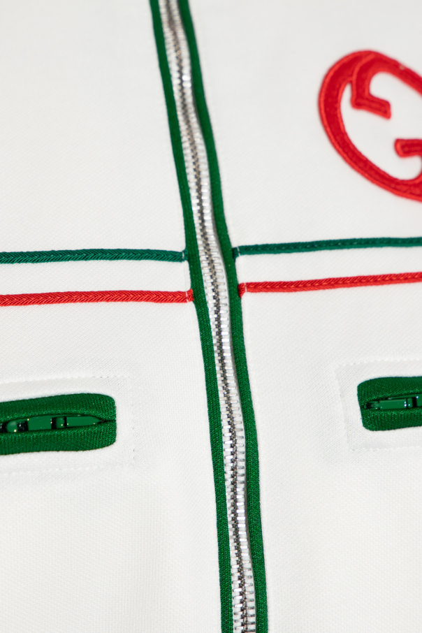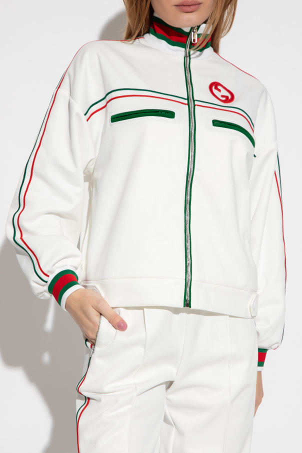 White, green and red sweatshirt with a standing collar from Gucci. Emblazoned with a logo-shaped patch, this style features a zip fastening, four pockets (including two zip ones), mesh lining, long sleeves as well as the brand\'s signature green-red-green ‘Web’ stripe detailing on the collar and cuffs.