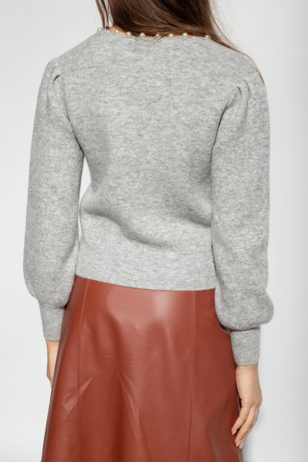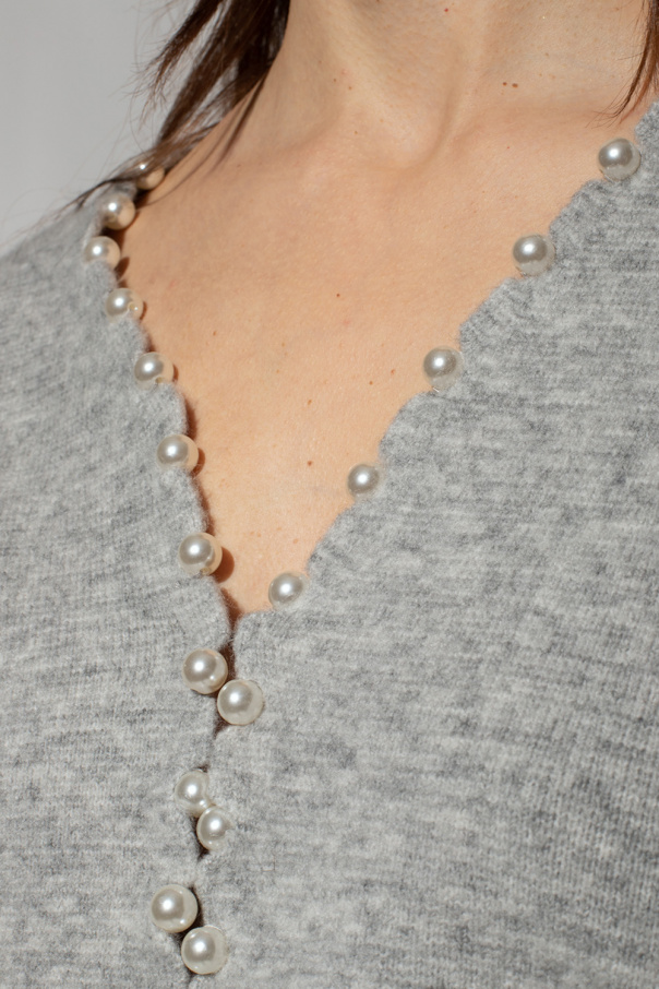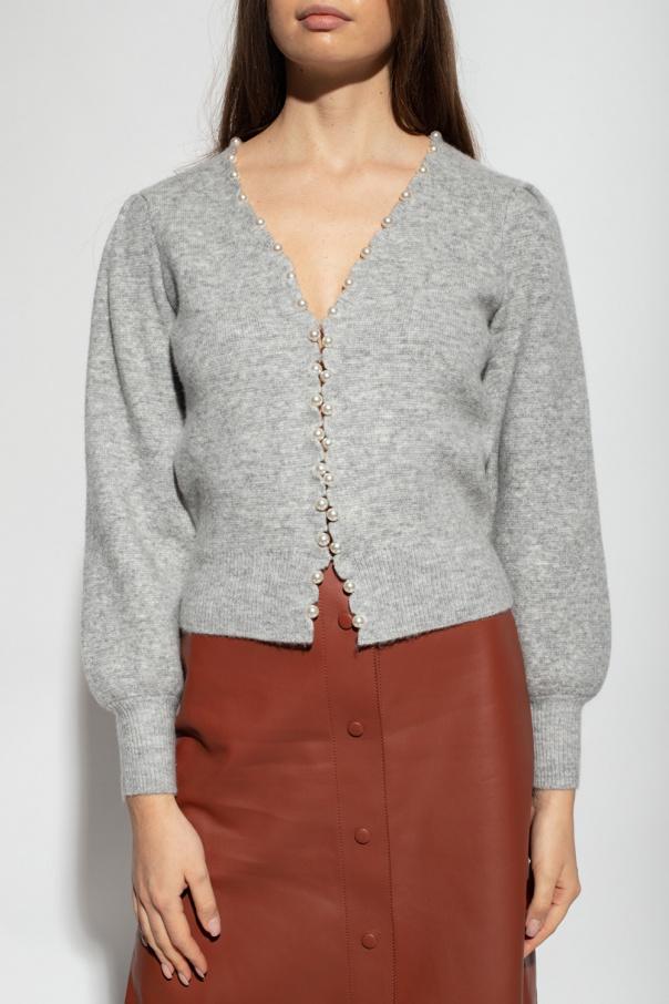 Grey cardigan from Kate Spade. Embellished with pearls, this style features a V-shaped neckline, hook & eye closures and long sleeves.