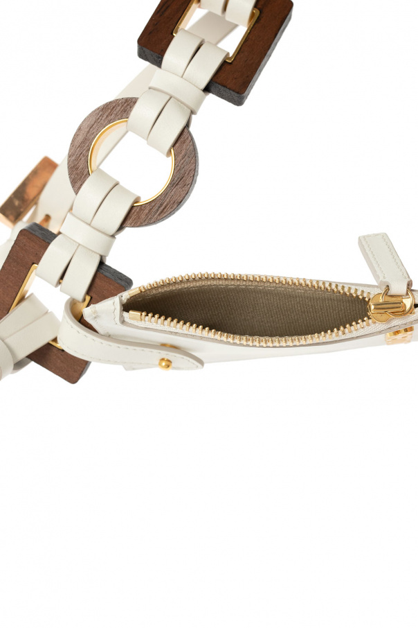 White \'La Ceinture’ detachable pouch on a decorative strap from Jacquemus. Made of leather, this item fastens via a zip and showcases a metal logo plaque and a strap entwined with brown appliqués.