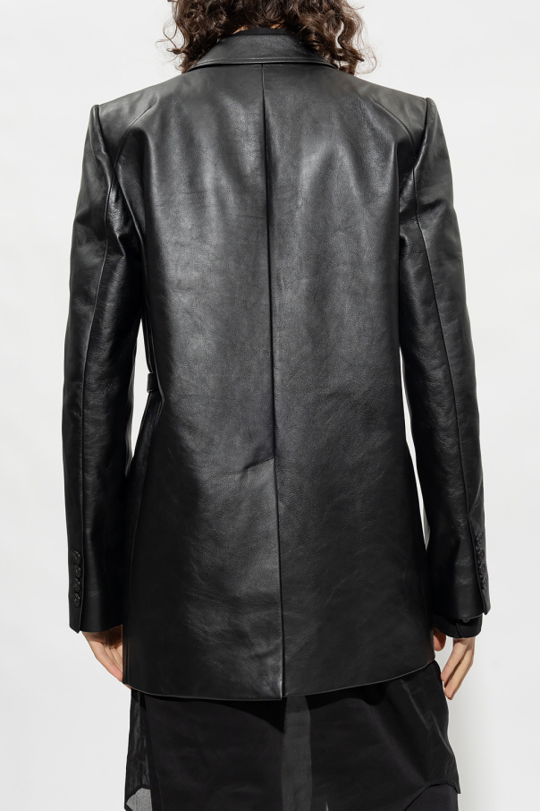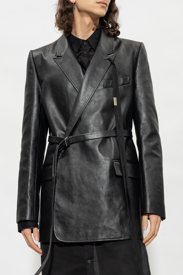 Black ‘Gerard’ double-breasted blazer from Ann Demeulemeester. Crafted from leather, this style features button fastenings, one slip pocket, two flapped pockets, peak lapels accentuated with decorative drawcords, a waist-cinching tie belt, a single back vent and long sleeves with button cuffs.