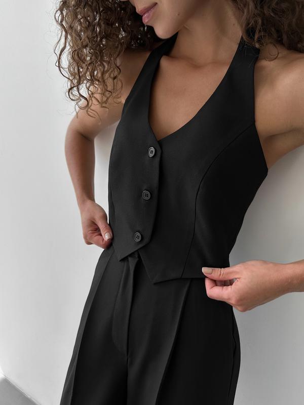 Однотонный жилет силуэтного кроя черного цвета. Модель с бретелями вокруг шеи и открытой спиной. Застегивается спереди на три пуговицы. Удачно сочетается с брюками палаццо, бермудам и пиджаком.