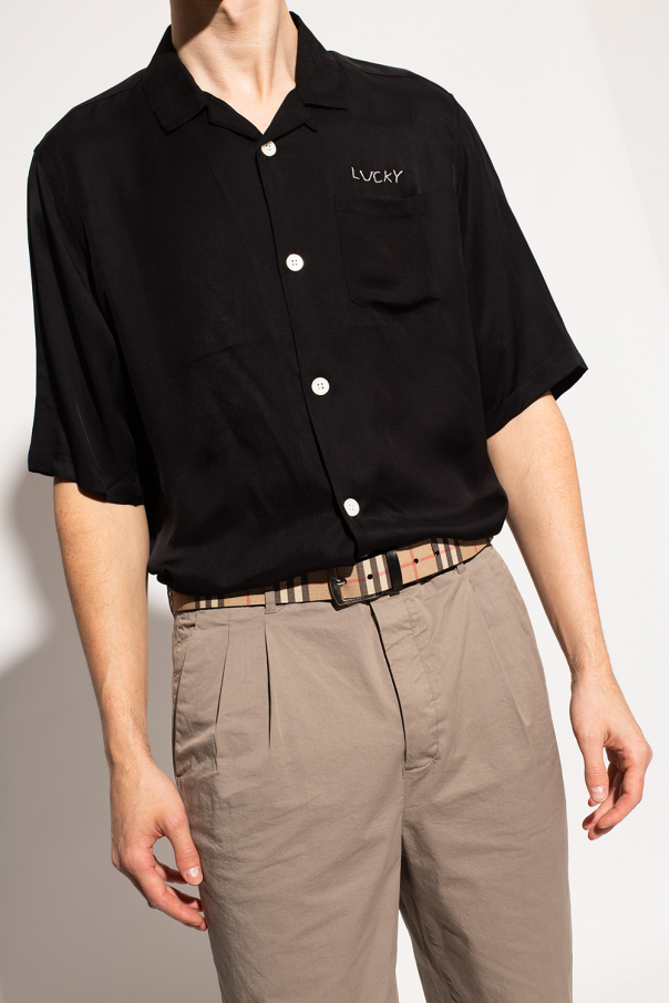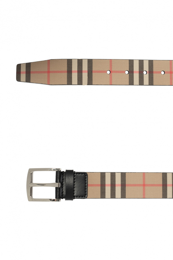 Black and beige belt from Burberry. Emblazoned with the brand\'s signature check in red, black and beige, this item features cow leather trims, an embossed logo and a silver-tone metal buckle.