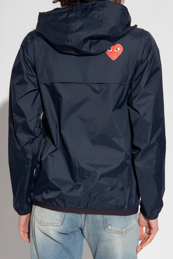 Navy and black rain jacket from Comme Des Garçons Play x K-Way. Fastened with a zip, this garment features a drawstring hood and hem, logo print, logo patch, two front zip pockets and long sleeves with elastic cuffs.