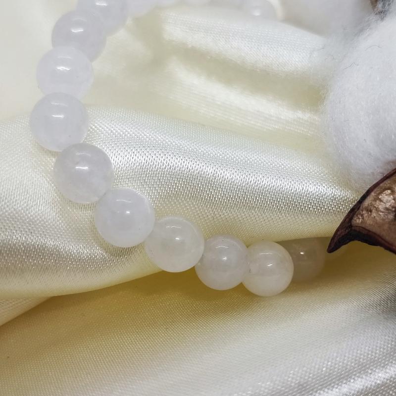 Этот браслет из частично прозрачного белого камня халцедона поражает своей