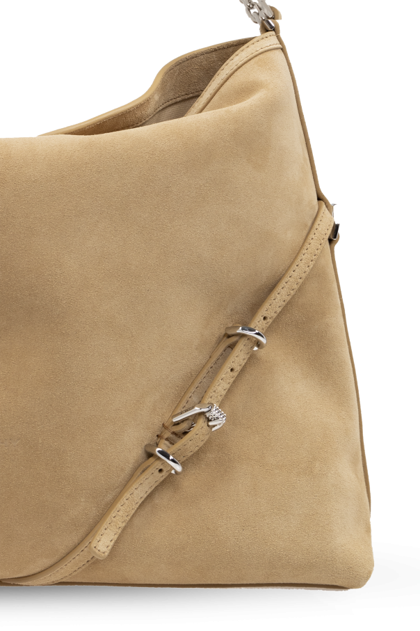 Introducing the Voyou Shoulder Bag by Givenchy, a quintessence of sophistication and refined taste. Crafted with an exquisite beige suede exterior, this accessory mimics the velvety touch of soft velvet, presenting an allure of understated luxury. Its semi-circular silhouette, accentuated by a broad base, ensures stability and poise, whether perched on a café table or nestled beside you at a soirée. The Voyou is detailed with distinctive silver clasps on its front, reminiscent of fine jewelry, which, alongside the chain-link straps, exudes an air of elegance and high craftsmanship. This piece is not only a testament to Givenchy\'s legacy of luxury but also a versatile addition to your wardrobe, seamlessly bridging the gap between daytime charm and evening sophistication. Within, the bag reveals an interior lined with a darker shade of beige, harmonizing beautifully with its exterior. A zipped pocket inside offers a secure haven for your treasured items, marrying functionality with fashion. Why Choose the Voyou Shoulder Bag? Exquisite Material: 100% suede exterior and interior fabric, promising durability and a plush feel. Unique Design: Silver decorative buckles and metal chain-link straps set this bag apart as a statement of luxury. Functional Elegance: A zipped inner pocket ensures your valuables stay secure in style. Signature Givenchy Craftsmanship: A testament to the brand\'s legacy in creating pieces that blend modernity with timeless elegance.