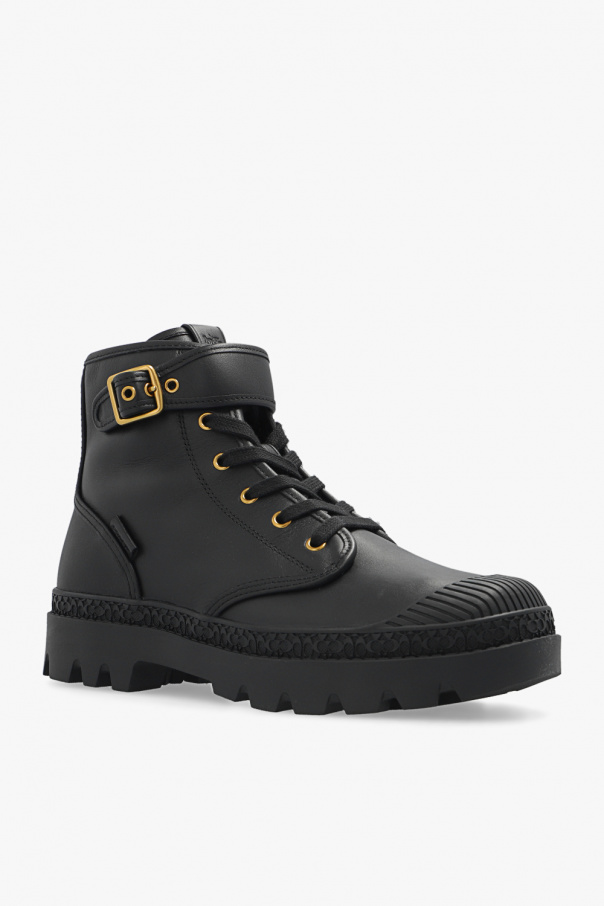 Black ‘Trooper’ boots from Coach. Made of leather, this lace-up pair features and adjustable buckle strap, logo patches, rubber toe guard and black rubber sole with a raised logo pattern.