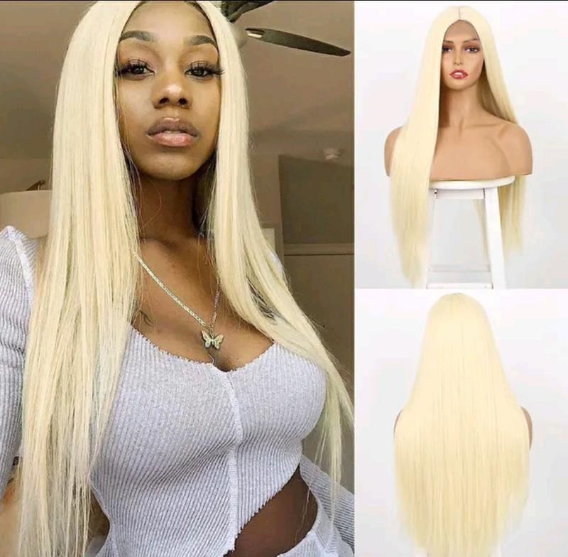 Парик блондинки из искусственных термоволос на сетке длинный прямой без чёлки.