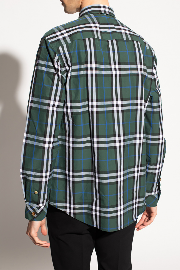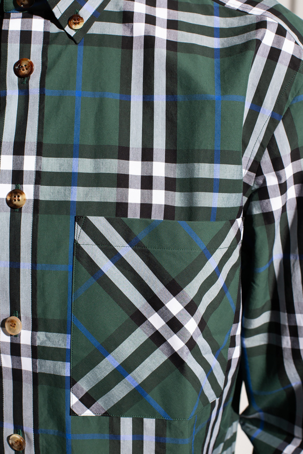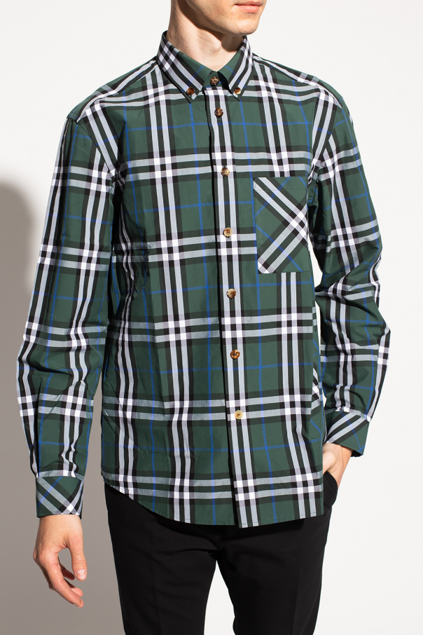 Green, black and white shirt from Burberry. Illustrated with a check pattern, this cotton-crafted style fastens via buttons and features a slip chest pocket and long sleeves with cuffed wrists.