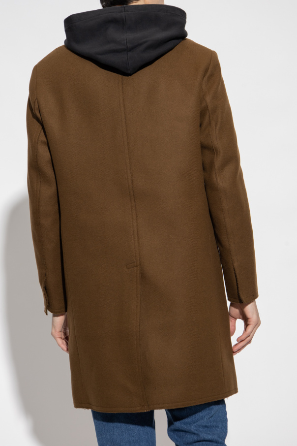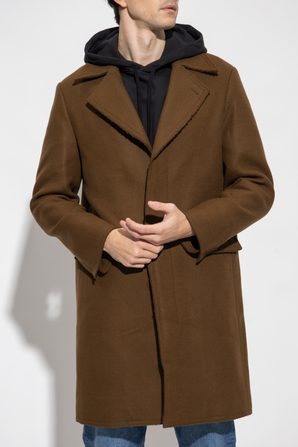 Brown ‘Rawston’ coat from AllSaints. Crafted from a wool blend and recycled wool, this garment features buttons with a concealed placket, notch lapels with raw cut edges, two flap pockets, single rear vent and long sleeves with concealed buttons.