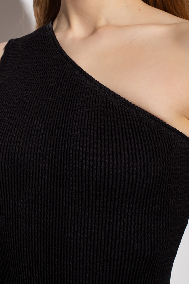 Black one-piece swimsuit from Bottega Veneta. Crafted from crinkly fabric, this style features a one-shoulder silhouette and distinctive piping. Drawstring pouch with a logo patch included.