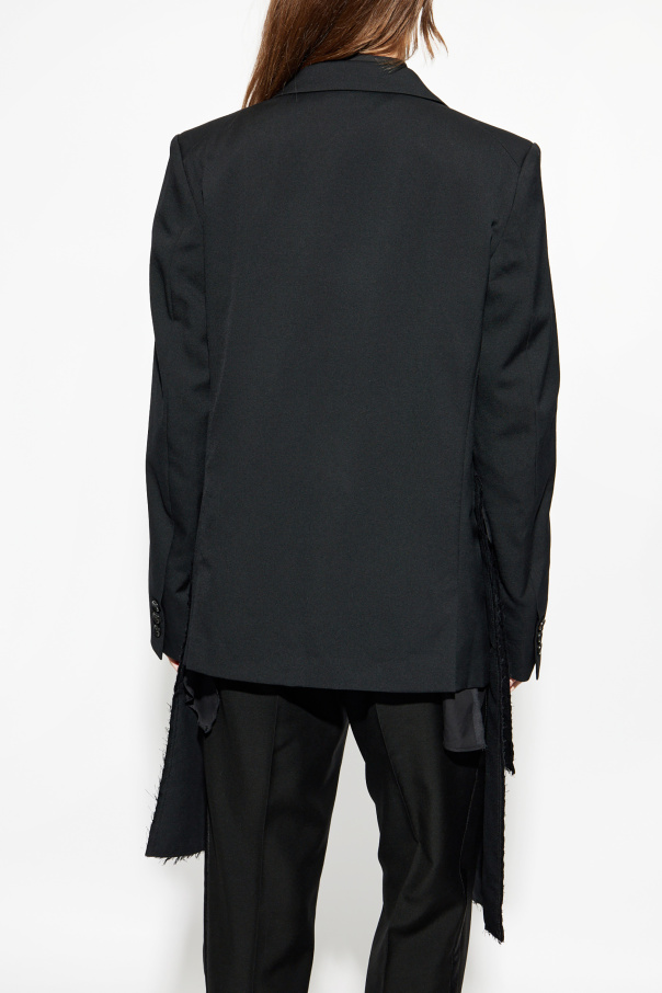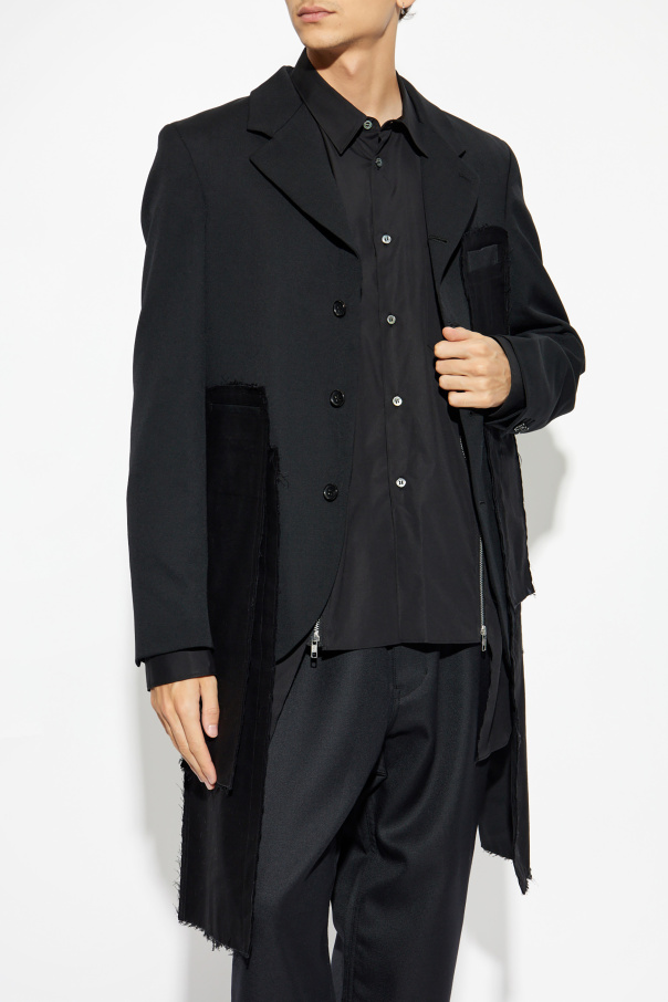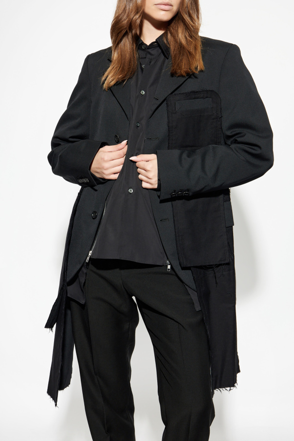 Unveil timeless sophistication with the Wool Blazer from the renowned Comme des Garçons Black collection. This meticulously crafted piece exemplifies understated elegance and contemporary design, making it a quintessential addition to any discerning wardrobe. Featuring a classic, slightly tailored silhouette with lapels and a three-button closure, this blazer exudes an air of refined charm. The dominant black hue underscores its versatility and polished demeanor, suitable for both casual and formal settings. Constructed from premium wool, it assures comfort and impeccable quality. Unique details such as the large, patch pocket on the left side with raw edge finishes and the asymmetrical, fringed hemline lend a modern, avant-garde touch, while maintaining a minimalist aesthetic with a clean back. Why Choose This Product? Unisex design, perfect for all genders Part of the \"Casual Jackets\" category, ideal for everyday and formal wear Versatile styling options, as showcased with black trousers and a shirt Exclusive collaboration between Comme des Garçons and Nike Four practical inset pockets