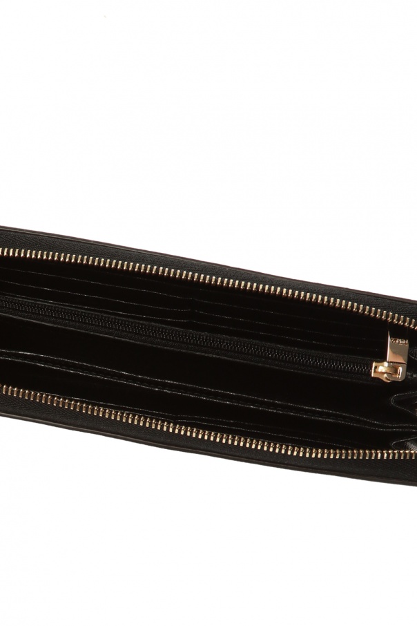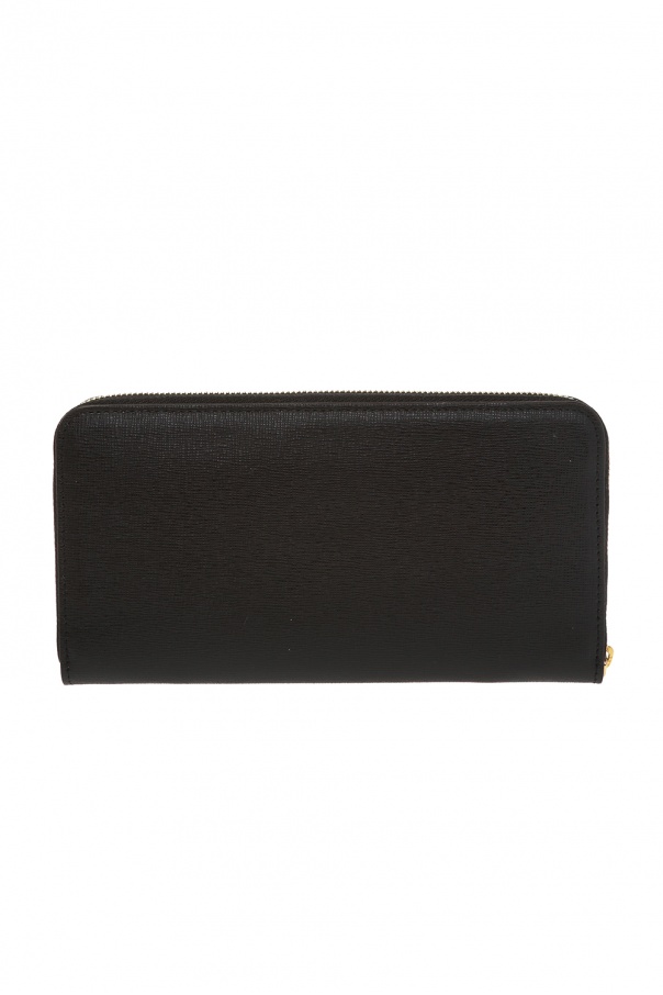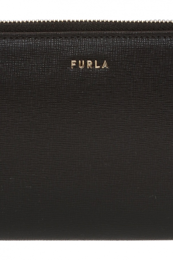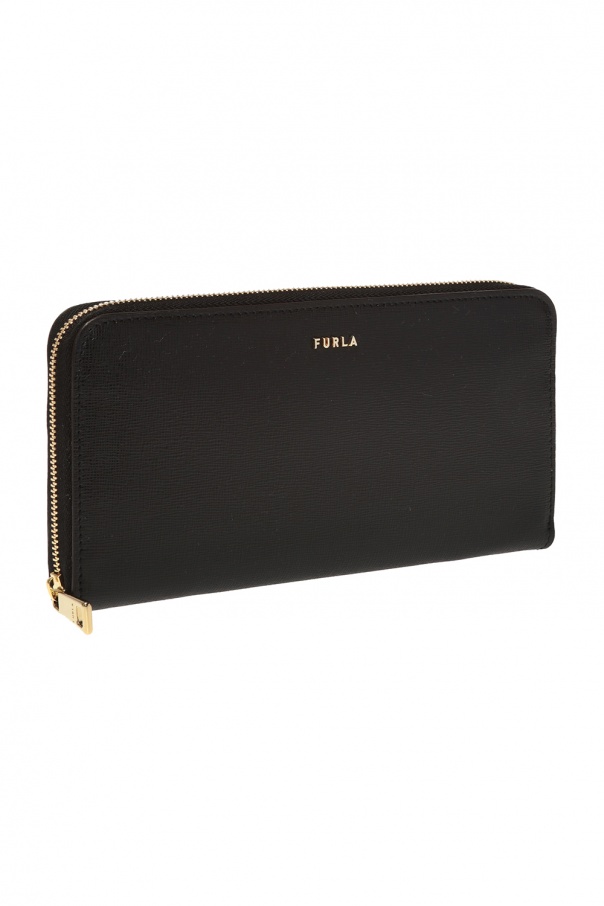 Black wallet from Furla. Made of leather. Zip-around fastening. Metal logo on the front. 3 bill compartments, a zippered coin pocket, 3 slip pockets and 12 card card slots inside. Gold-tone metal hardware.