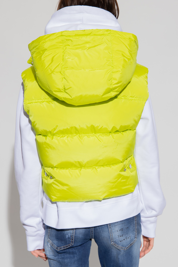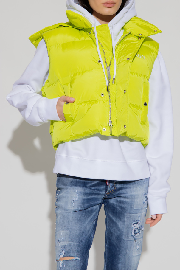 Green down vest from Dsquared2. Embellished with a white logo print, this style fastens with a zipper and snaps and features a drawcord-adjustable hood and two snap-fastened pockets.