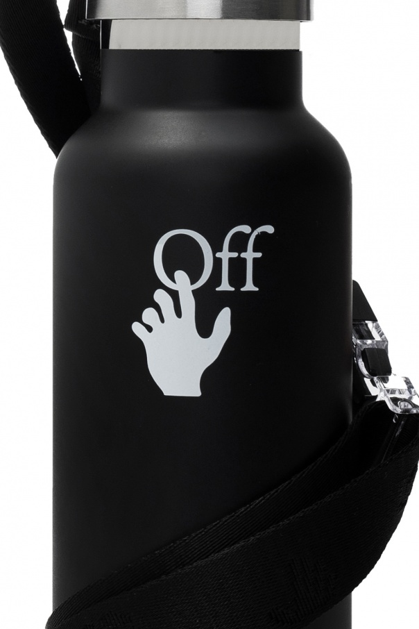 Black and silver-tone water bottle from Off-White. Made of stainless steel, this item features a printed logo pattern in white and a removable strap.