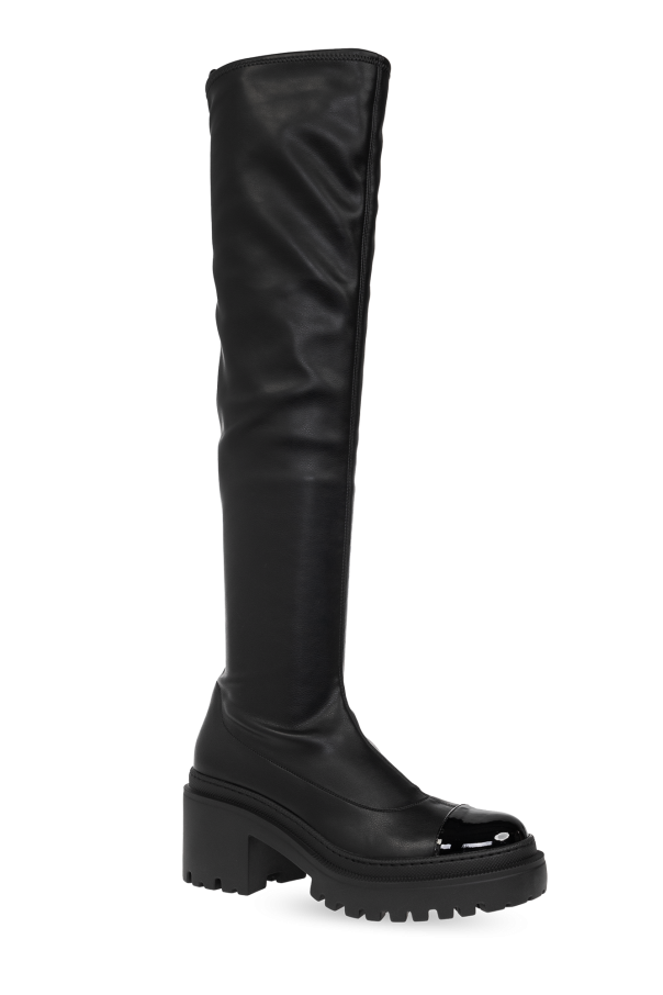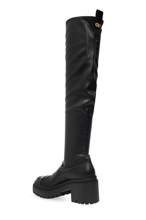 Black ‘Avela’ knee-high boots from Giuseppe Zanotti. Made of stretch faux leather, this slip-on pair features a glossy toe, pull tab at the back, a logo detail in gold-tone and a black rubber sole.