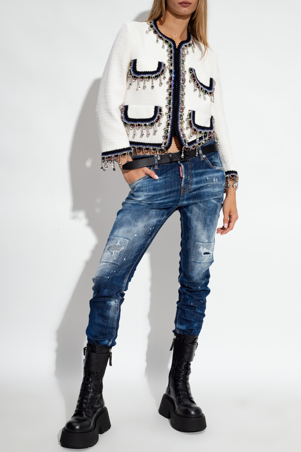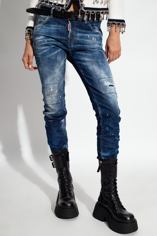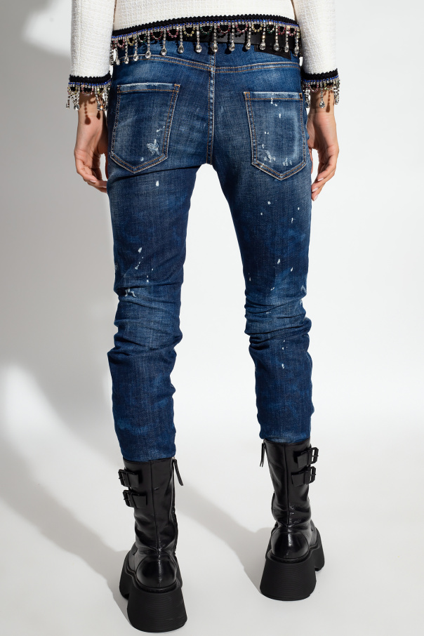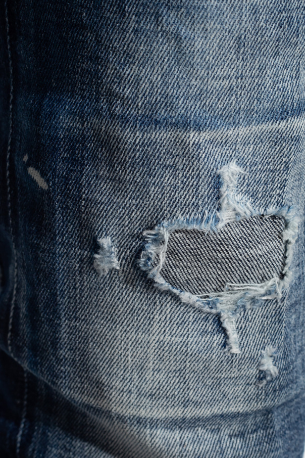 Dark blue ‘Cool Guy’ jeans from Dsquared2. Cut with a low-rise waist, this pair falls with slightly tapered legs and features button fastenings, classic five pockets and signature distressed details and paint splatters.