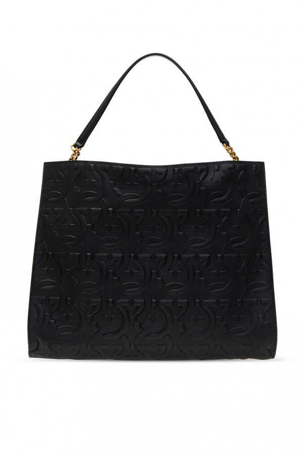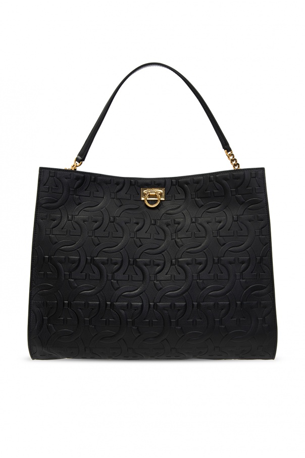 Black hand bag from Salvatore Ferragamo. Crafted from textured calf leather which was covered in an all-over embossed Gancini pattern, this design features a distinctive gold-tone fastener with embossed logo, two half-round handles and interior with one compartment, three slip pockets and a detachable zipped pouch.