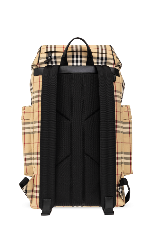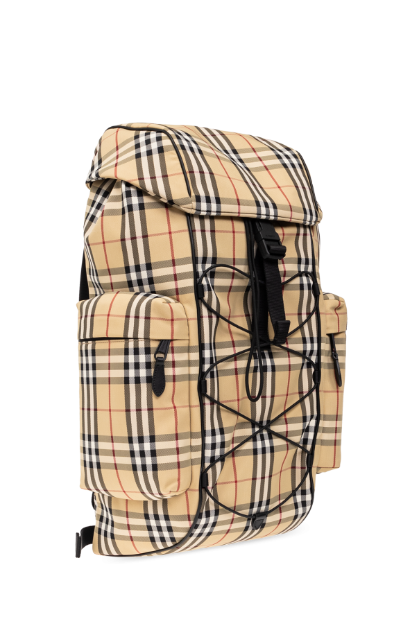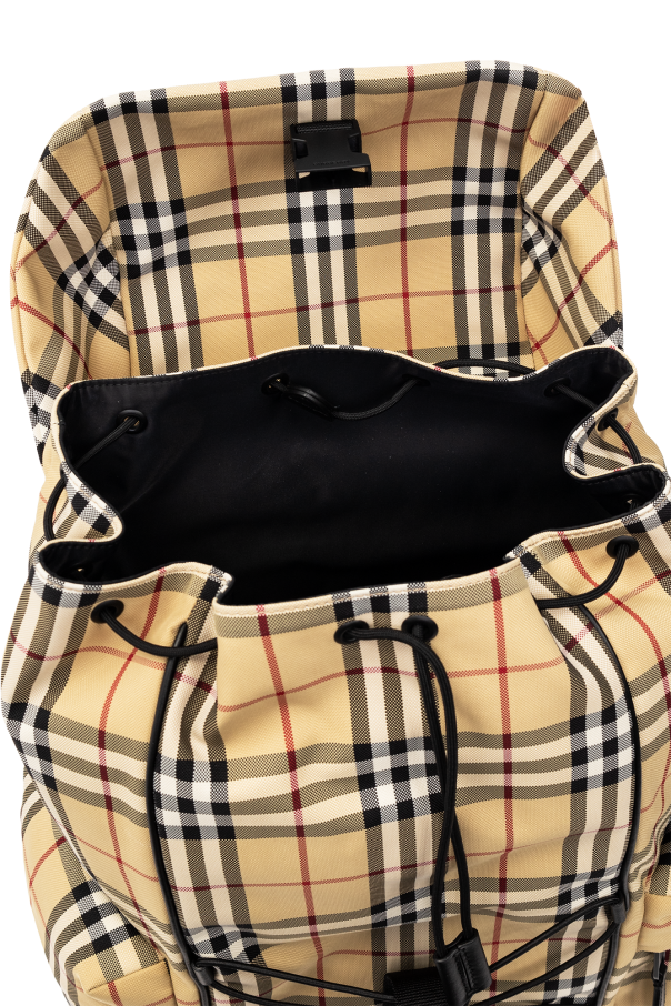 Beige ‘Murray’ backpack from Burberry. Made of canvas with the brand’s signature check in white, black and red with calf leather trims, this model fastens with a snap button and is complete with decorative drawstrings, zip pockets on the sides, top handle, adjustable shoulder strap and one internal compartment with drawstrings and one slip pocket.