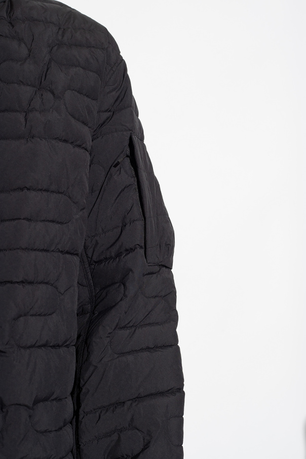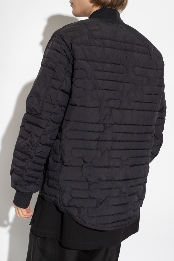 Black quilted jacket from Y-3 Yohji Yamamoto. Fastened with snap buttons, this long sleeve design features recycled 3M™ Thinsulate™ insulation, logo print at the back, two zip pockets, collar and ribbed edges.