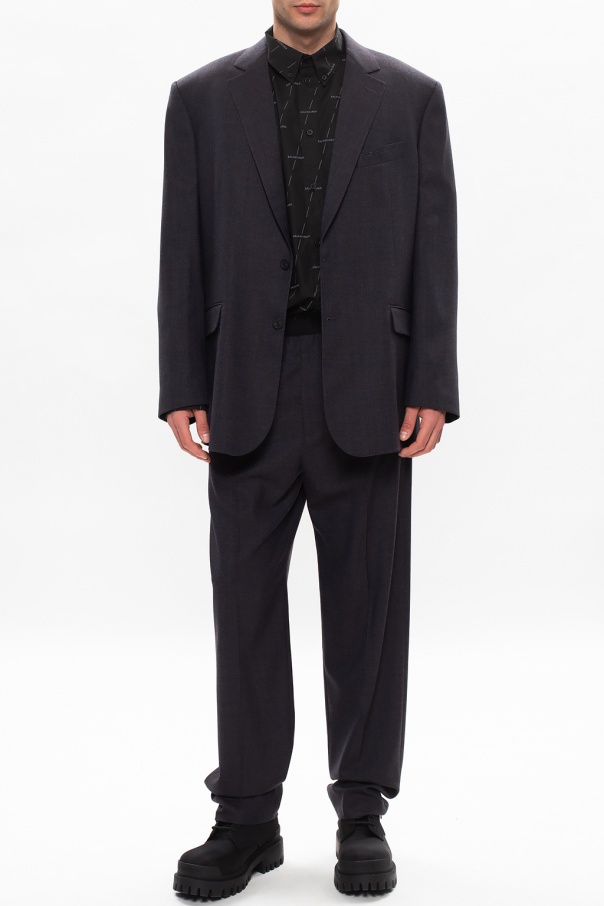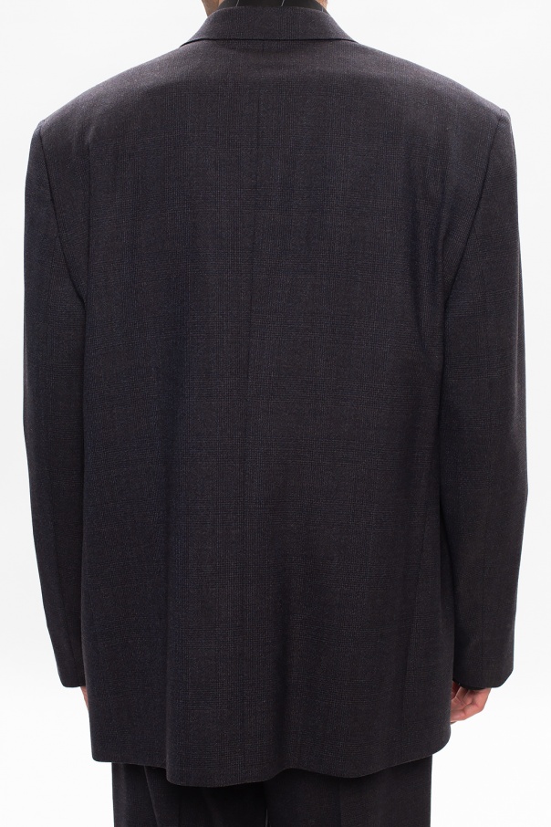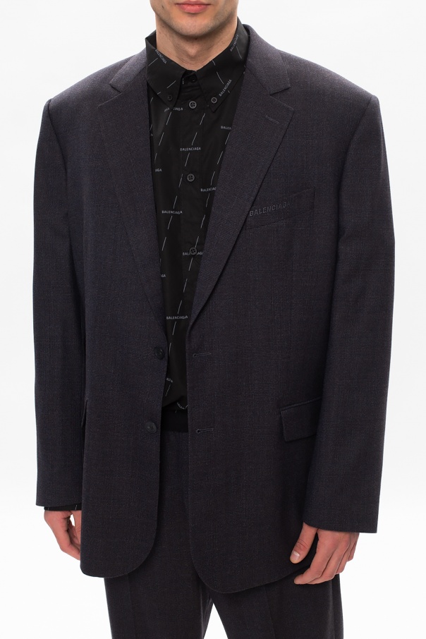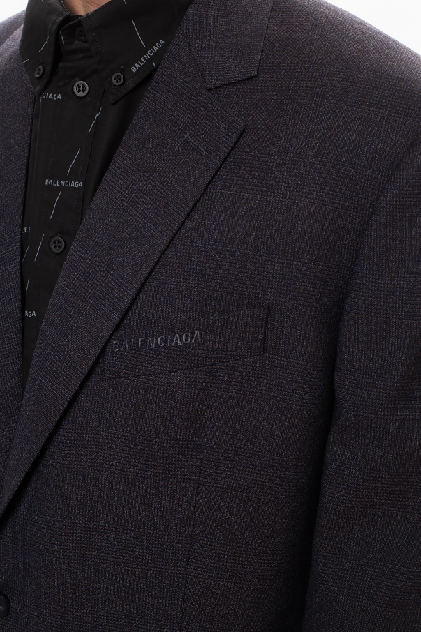 Dark grey blazer from Balenciaga. Rendered in wool with fine check pattern, this style fastens via buttons and features long sleeves, three pockets on the front, including two flapped ones, and a logo embroidery for the brand recognition.