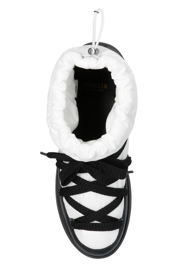 White and black ‘Insolux M’ snow boots from Moncler. Trimmed with leather, this pair fastens with laces, drawstrings, transparent inserts, raised logo at the back and black rubber sole.