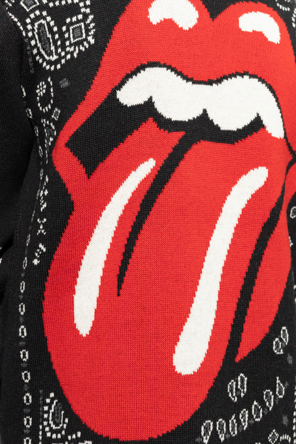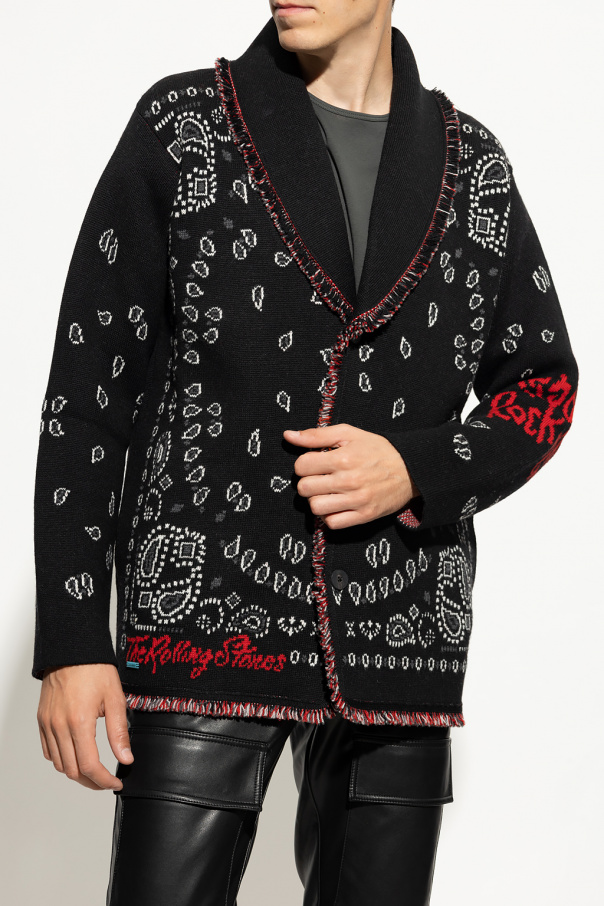 Black, white and red ‘It's Only Rock’n’Roll’ cardigan from Alanui. Made of wool, this garment is complete with button fastenings, embroidered paisley pattern, iconic Rolling Stones tongue and logo, embroidered lettering, decorative collar, fringe edges and long sleeves.