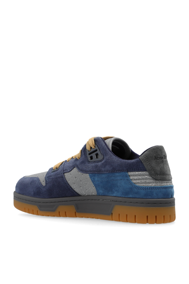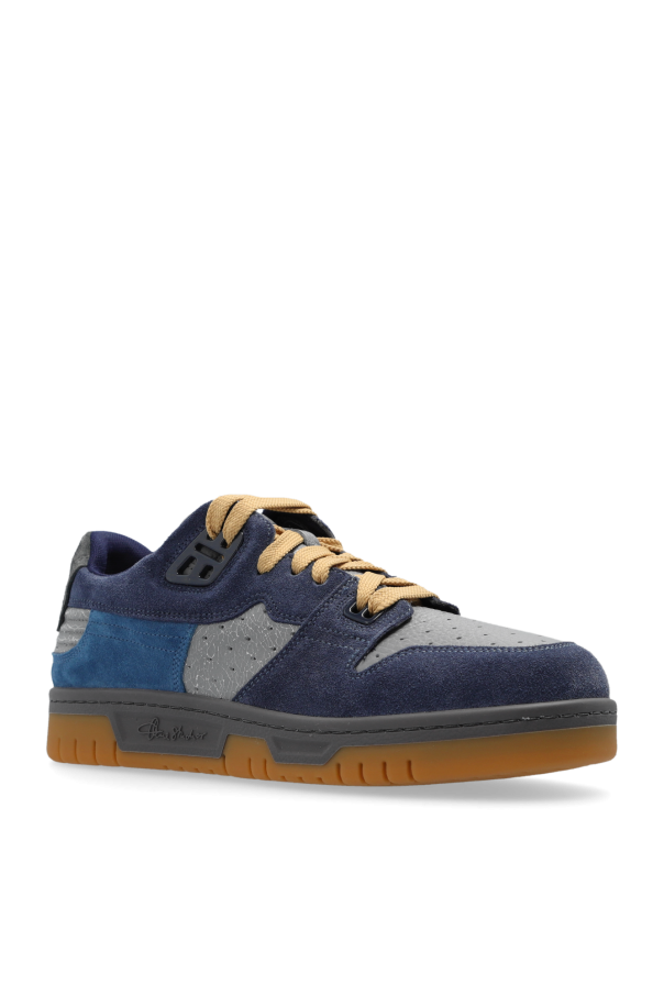 Navy blue, blue and grey sneakers from Acne Studios. Made from suede and leather with a vintage effect, this lace-up model sits on a beige rubber sole and showcases an embossed logo on the back and perforations on the front and sides.
