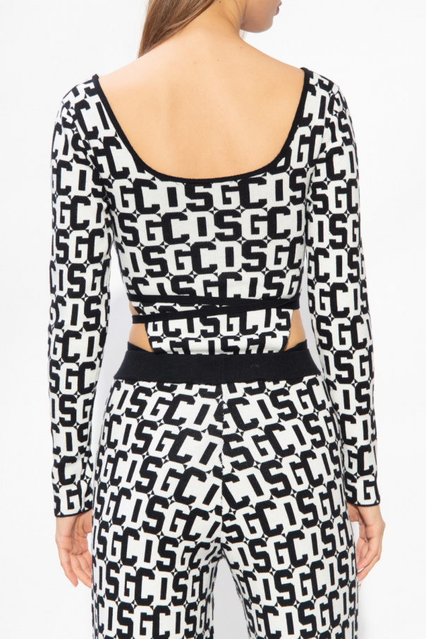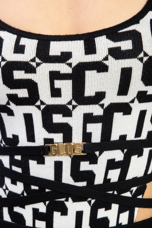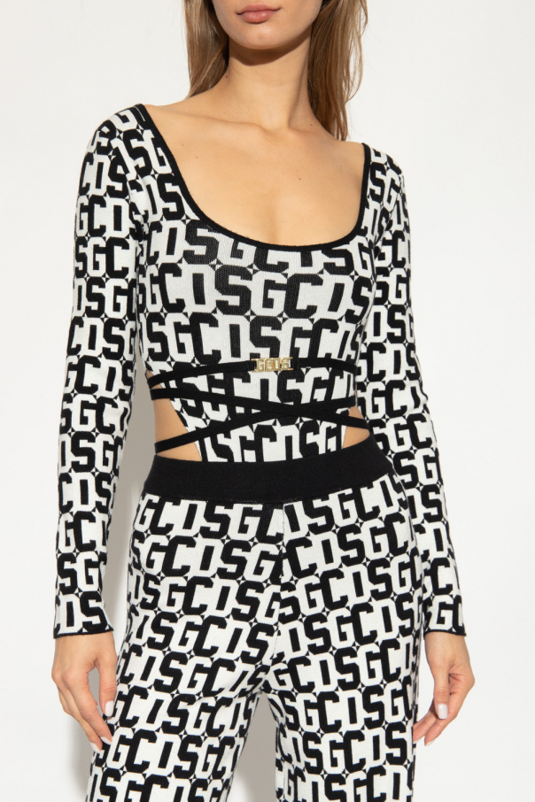 Black and white body with high leg cut-outs, boat neck, long sleeves and snap closure from GCDS.