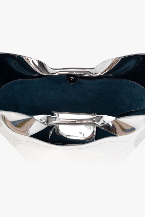 Silver-tone ‘The Bow Large’ shopper bag from Alexander McQueen. Crafted from faux leather with a mirror effect, this design fastens with a snap and showcases an embossed logo on the front, two handles, silver-tone metal hardware and one internal compartment with a removable zip pouch featuring a card slot.