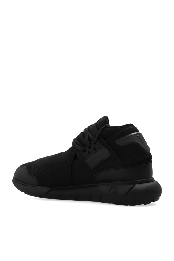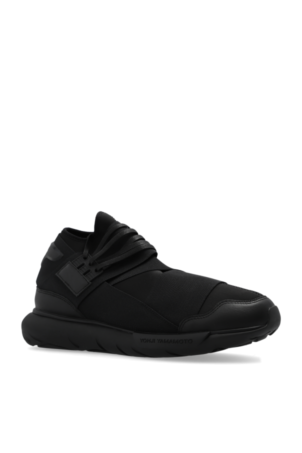 Black ‘Qasa’ high-top sneakers from Y-3 Yohji Yamamoto. Crafted from fabric trimmed with mesh and leather in beige, this lace-up pair features crossed elastic straps, rubber logo patch at the back, PORON® cushioning and black Tubular outsole made from EVA.