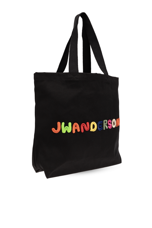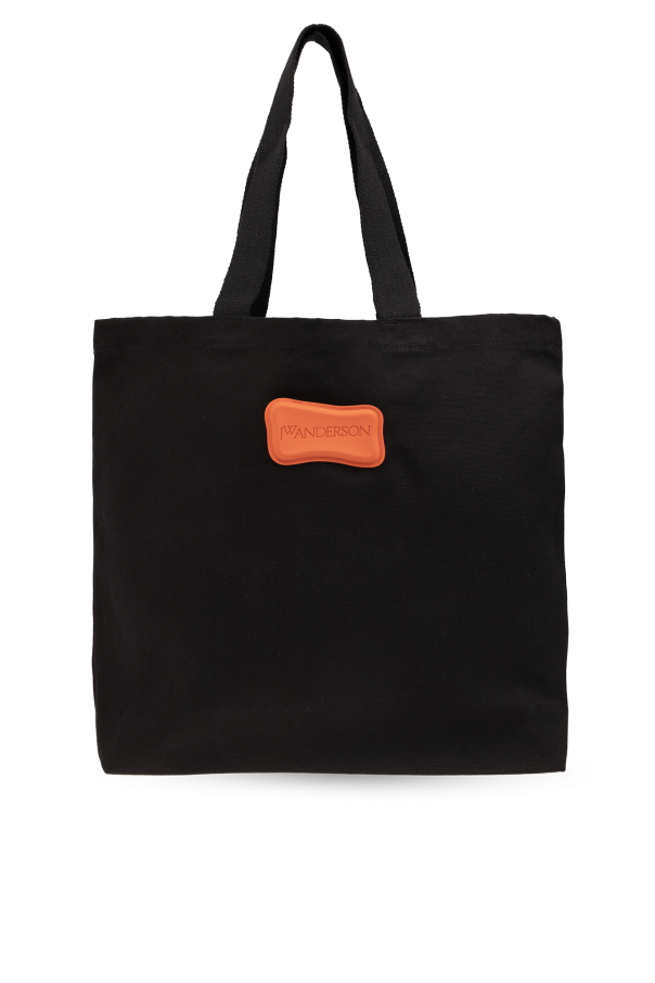 Black shopper bag from JW Anderson. Made from cotton canvas, this design showcases an embroidered colourful logo on the front, two half-round handles, one internal compartment and an orange rubber patch on the back.