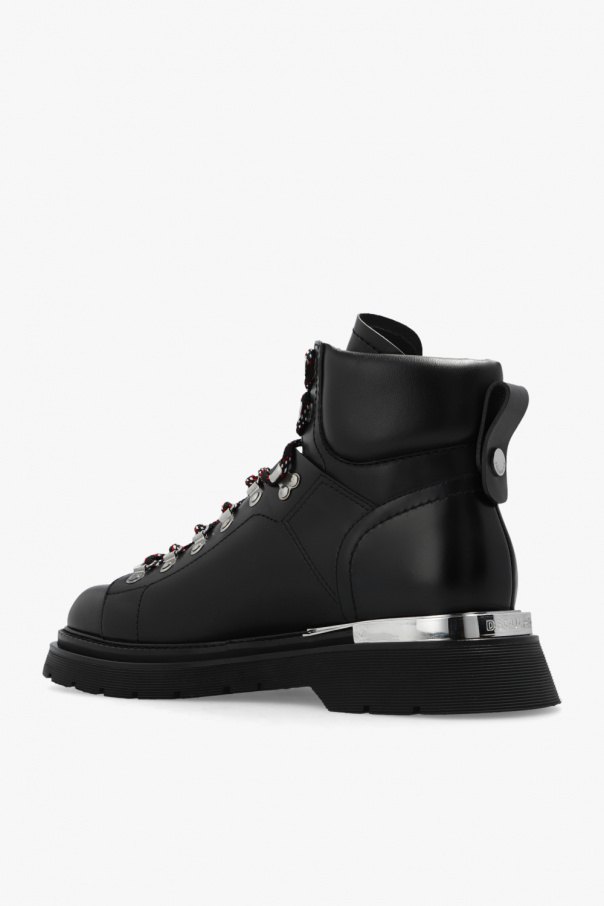 Black boots from Dsquared2. Made of leather, this lace-up pair features a silver-tone metal appliqué and logo at the back, black, white and red laces and black rubber sole.