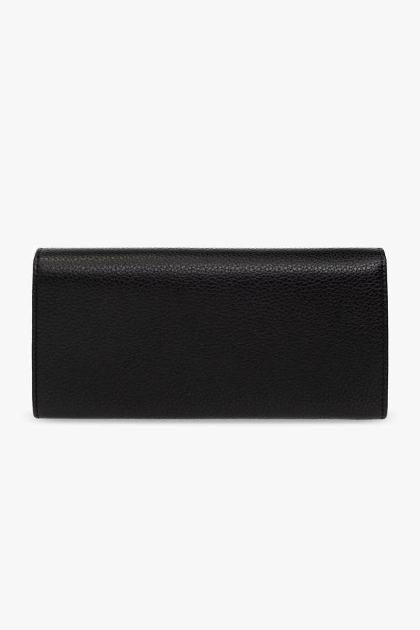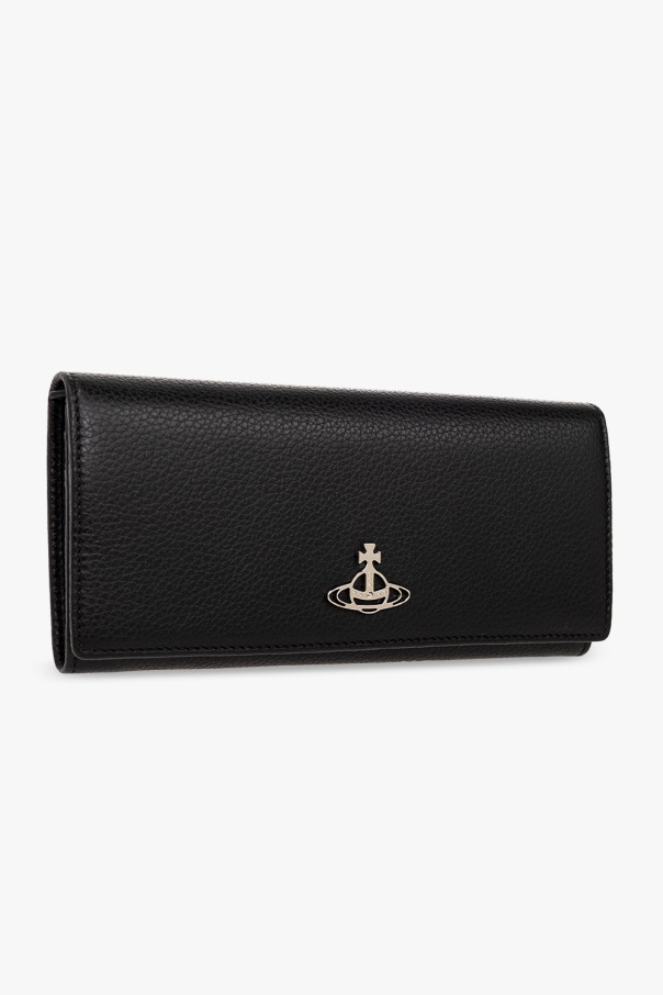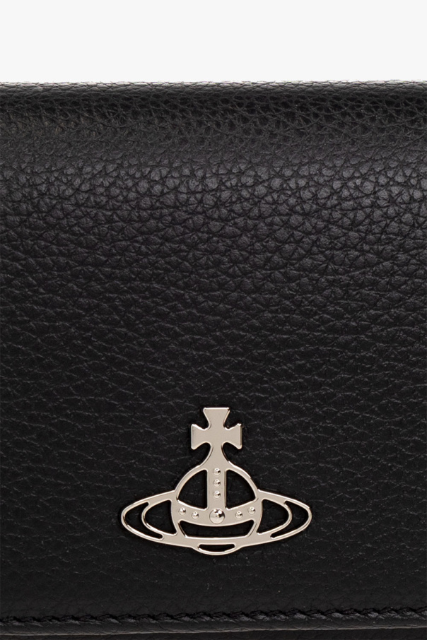 Black wallet from Vivienne Westwood. Made of leather, this item fastens with snap buttons and is decorated with a silver-tone metal detail. It has two bill compartments, one zipped coin pocket, two slip pockets and eight card slots.