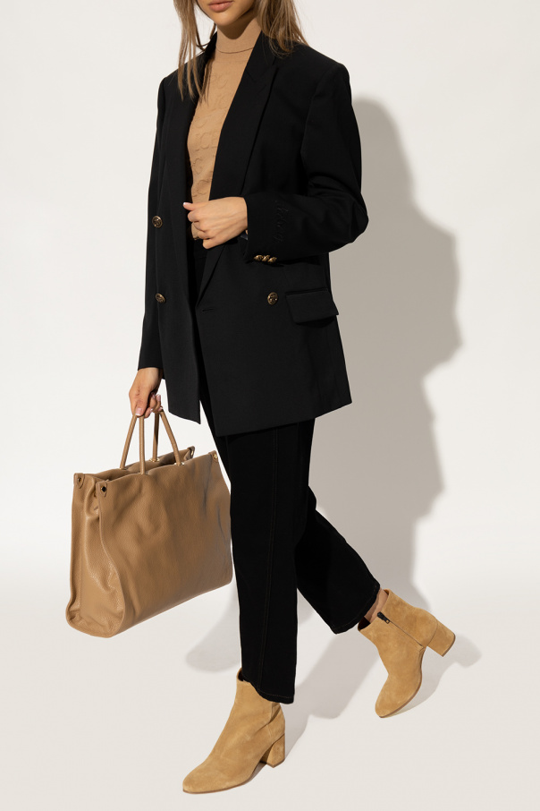 Beige ‘City’ heeled ankle boots from Common Projects. Crafted from suede, this model sits on a light beige leather sole and features a gold-tone graphic print and a zipper on the side.