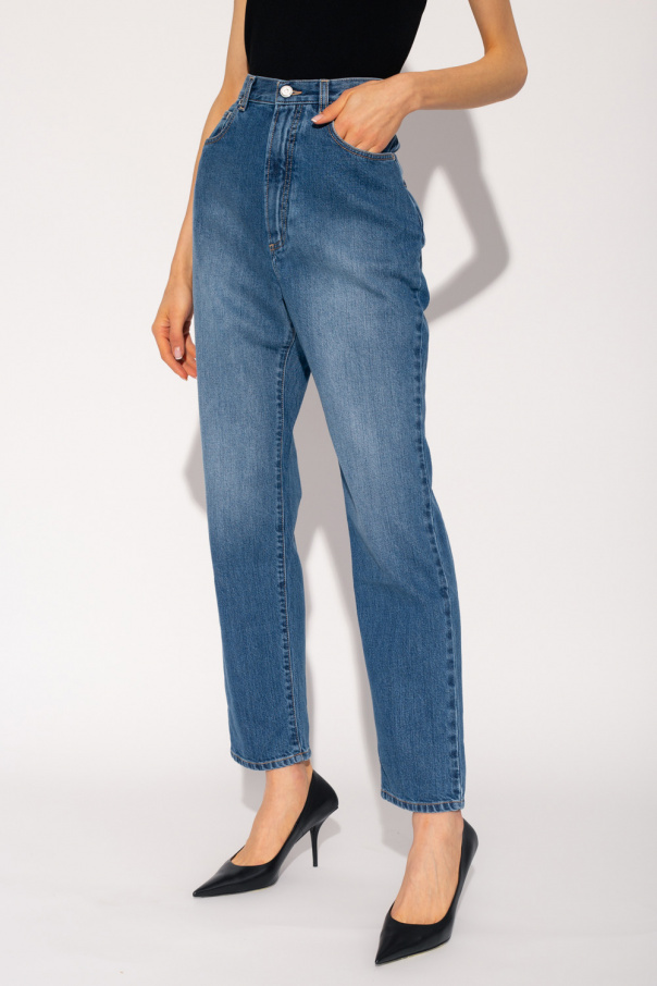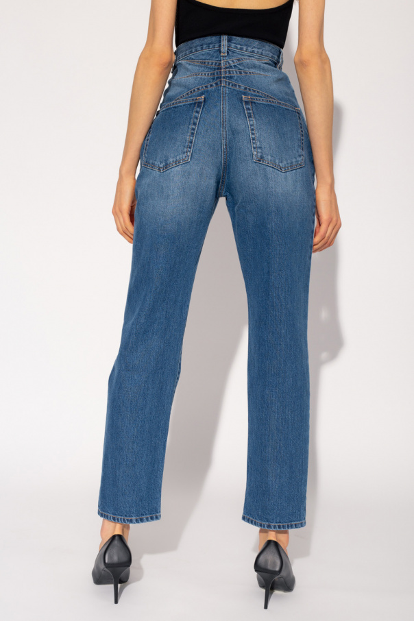 Blue high-waisted jeans from Alaia. Fastened with a zip and button, this pair falls down with straight legs and features decorative stitching details, three front pockets and two back pockets.
