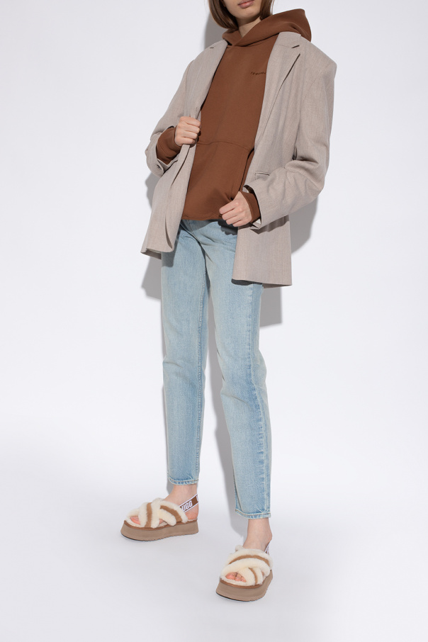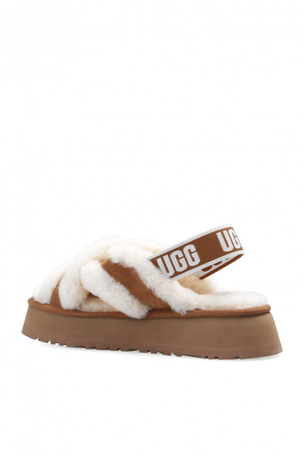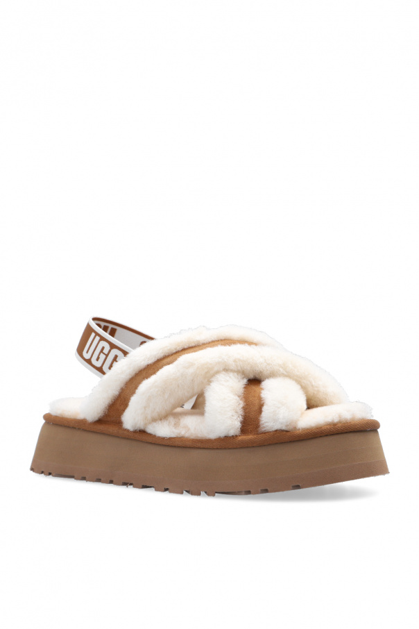 Light brown and cream ‘Disco Cross’ sandals from UGG. Made of leather with cream shearling, this pair features a logo-embroidered elastic strap at the back and brown sole made of EVA foam.